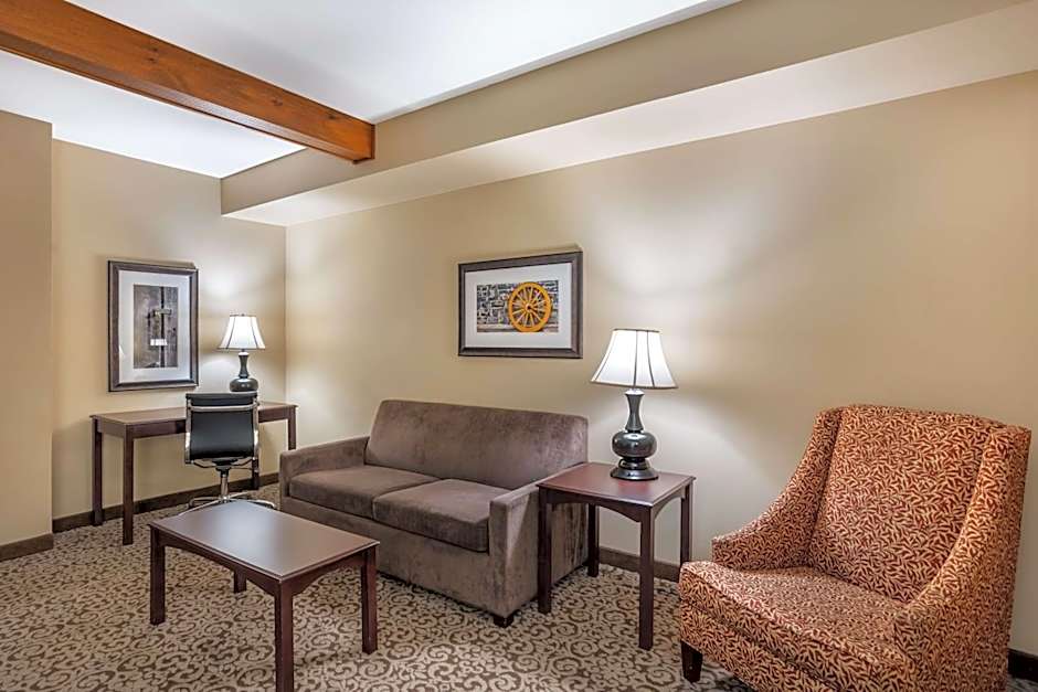 This suite feature a separate seating area, a kitchenette, and a flat-screen TV with premium cable channels. A private bathroom with a hair dryer is also included.